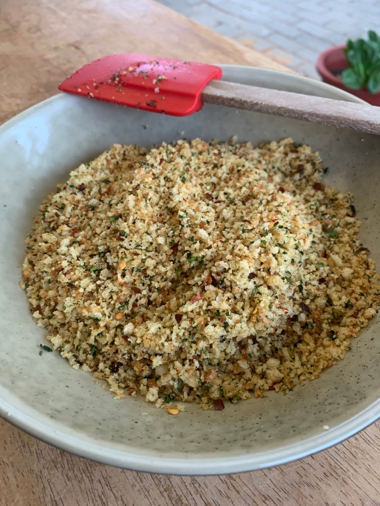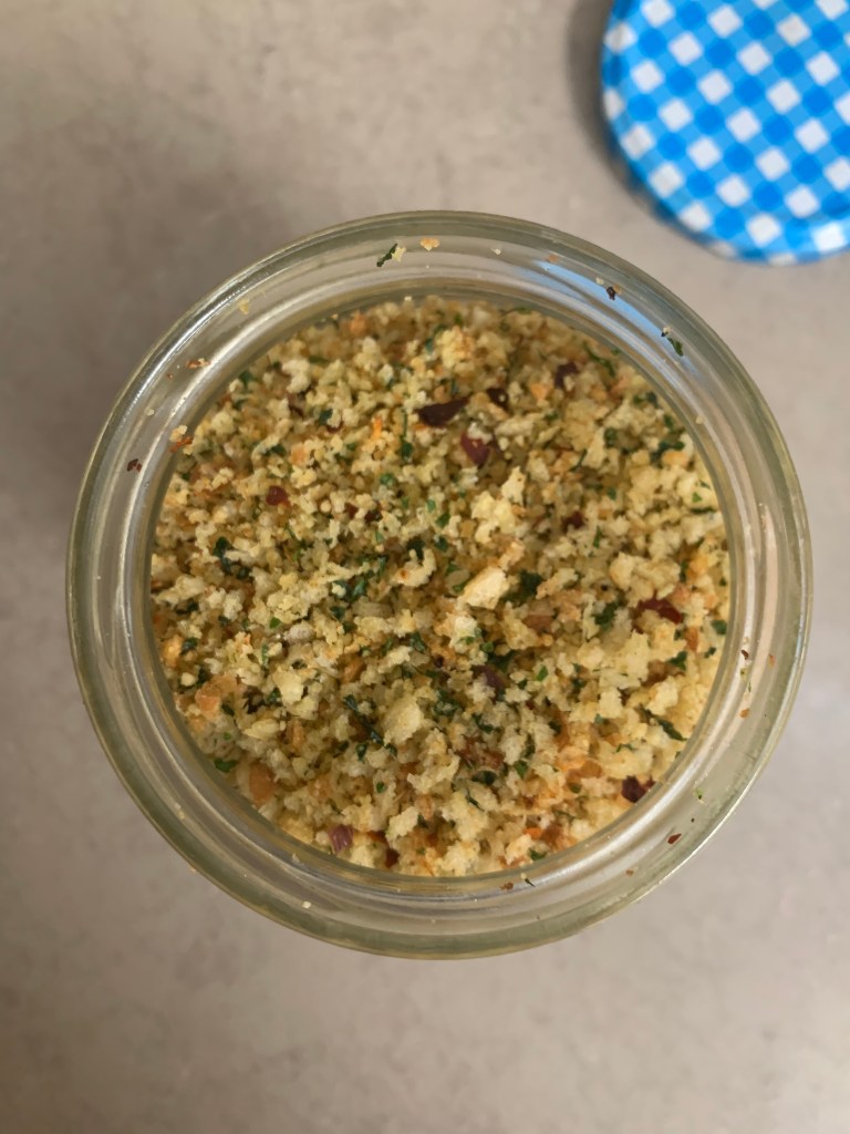 The breadcrumbs themselves are toasted or more- lightly fried with herbs and garlic, and for those of us who enjoy it, a nice hit of chilli too. Once completely cooled, I add parmesan to the mix and pop it in a jar in the fridge. Because it is fried and has a good amount of salt in it, it will last a good while in your fridge without going bad. Months even. Very handy indeed!